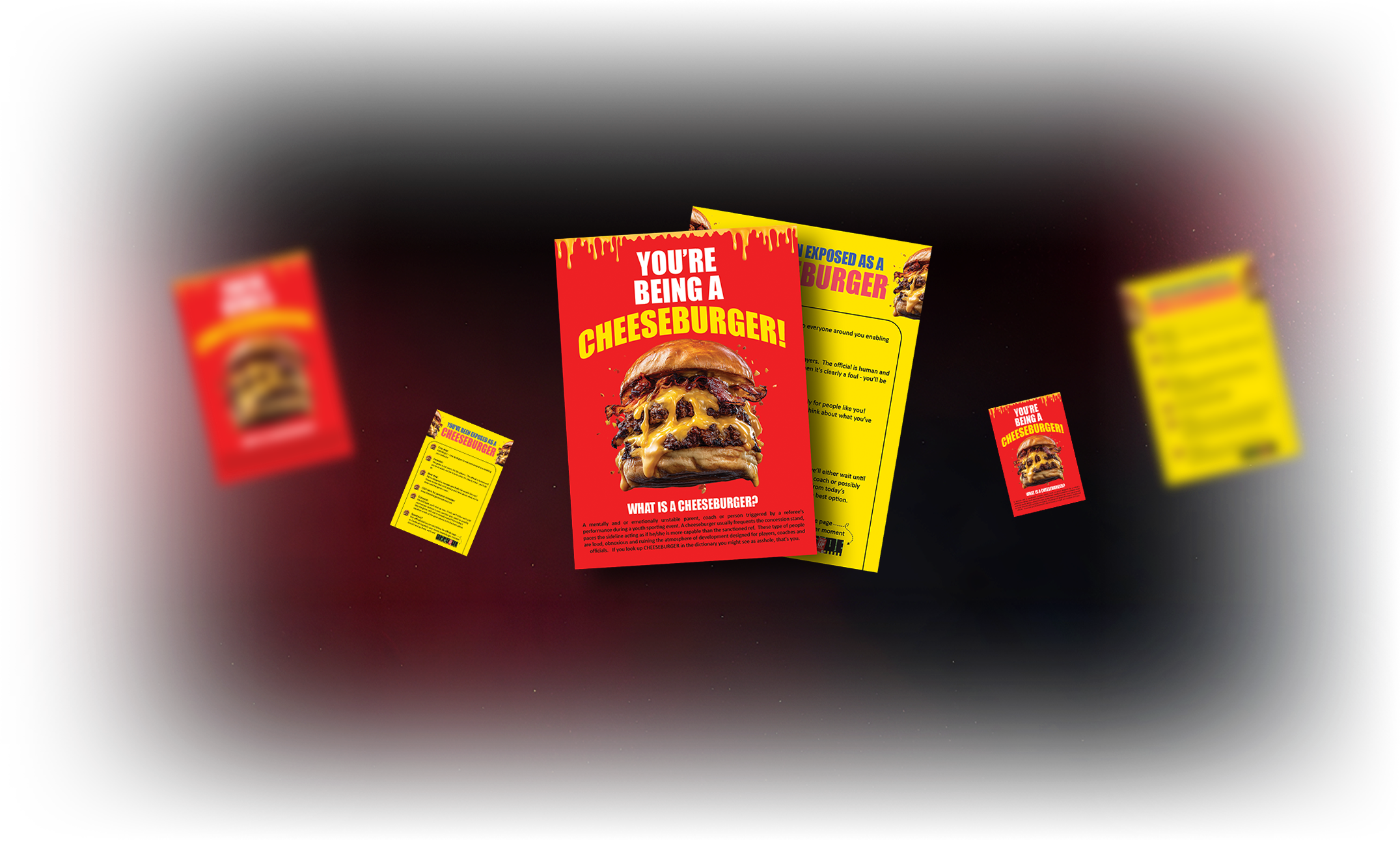 A Cheeseburger is someone who acts irrationally, inappropriately, or aggressively at youth sports events – usually parents yelling at refs, coaches losing their minds, or anyone who forgets it’s just a game. Barlow coined the term to call out this toxic behavior in a humorous but direct way.